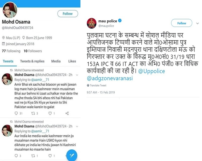 10. मऊ, यूपी में रहने वाले मो. ओसामा ने शहीदों का अपमान किया और पाकिस्तान का समर्थन किया। यूपी पुलिस ने तुरंत मामला दर्ज करते हुए। मो. ओसामा को गिरफ्तार कर लिया।