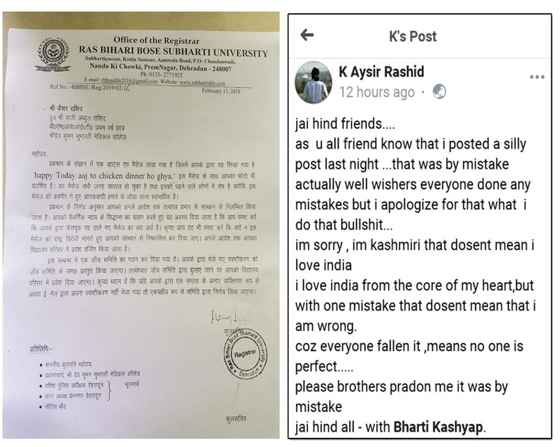 11. देहरादून सुभारती यूनिवर्सिटी में पढ़ने वाले राशिद ने पुलवामा अटैक के बाद जश्न मनाने का स्टेट्स डाला। शिकायत मिलने पर यूनिवर्सिटी ने तुरंत राशिद को निलंबित कर दिया।