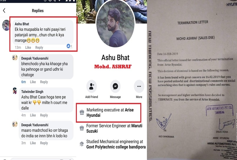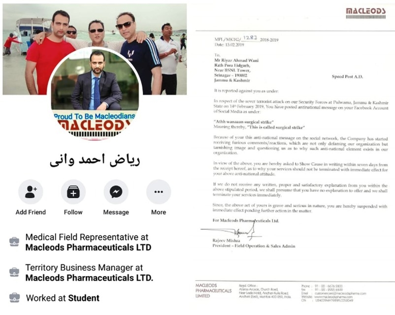 12. श्रीनगर में रहने वाले रियाज़ अहमद वानी अक्सर अपने फेसबुक पर आतंकियों के पक्ष में स्टेट्स डालता रहता था। पुलवामा हमले के बाद भी रियाज ने ऐसा ही स्टेट्स डाला। लेकिन इस बार उसको भारी पड़ा प्राइवेट कंपनी मैकलॉयड ने उनको नौकरी से बाहर कर दिया।