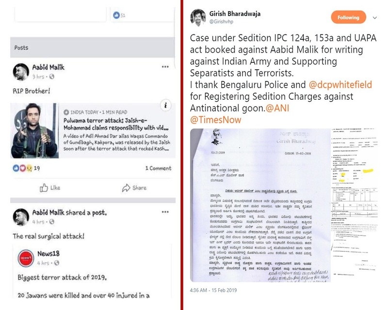 13. बंगलुरू में रहकर नौकरी करने वाले कश्मीरी आबिद मलिक फिदायीन आतंकी के पक्ष में स्टेट्स डाला। हमले के बाद जश्न मनाया। इसके बाद बंगलुरू पुलिस ने देशद्रोह की धाराओं में आबिद पर केस दर्ज कर लिया।