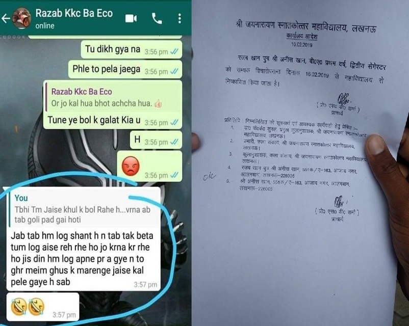 15. लखनऊ में रज़ाब ने फेसबुक-व्हाट्सअप पर पुलवामा हमले की खुशियां मनाने के पोस्ट डाले। कॉलेज ने तुरंत उनको निष्कासित कर दिया। साथ ही रज़ाब पर एफआईआर दर्ज की ली गयी और गिरफ्तार कर लिया गया।