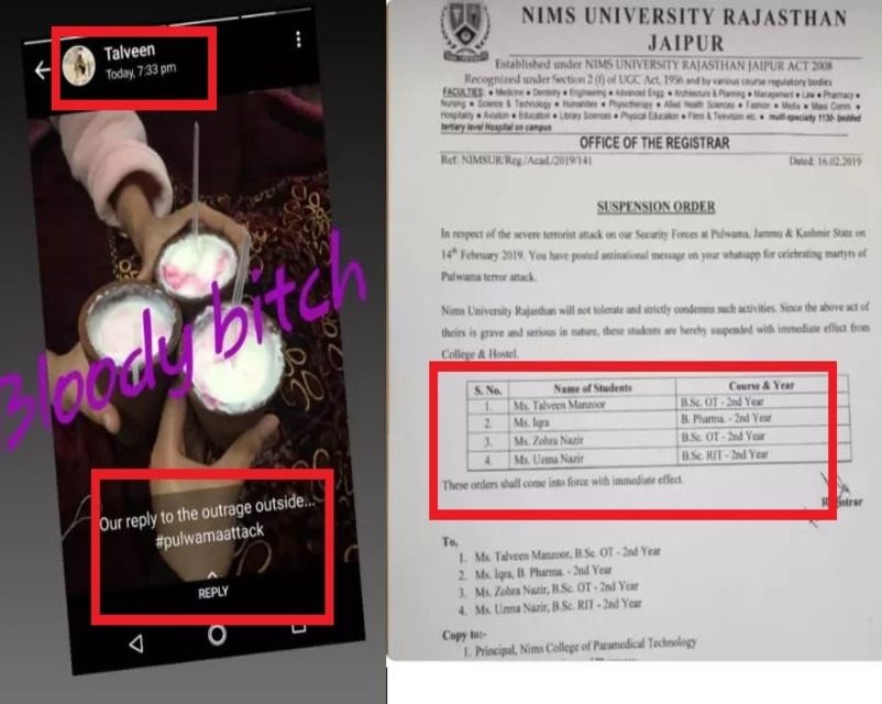 3. जयपुर की प्राइवेट यूनिवर्सिटी में पढ़ने वाली कश्मीरी तवलीन मंजूर ने जश्न मनाने का स्टेट्स डाला, तो यूनिवर्सिटी ने उनको और उनकी 3 और सहेलियों को बाहर का रास्ता दिखा दिया।
