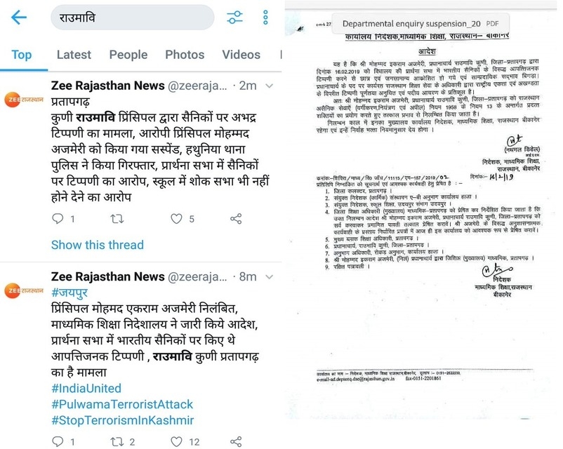 4. राजस्थान के जिला प्रतापगढ़ में एक स्कूल प्रिंसिपल मोहम्मद अजमेरी ने न सिर्फ शहीदों पर अभद्र टिप्पणी की, बल्कि स्कूल की प्रार्थना सभा में सुरक्षाबलों पर अभद्र बातें कहीं। इसके लिए उनको सरकार ने सस्पेंड कर दिया, साथ ही गिरफ्तार भी कर लिया गया।
