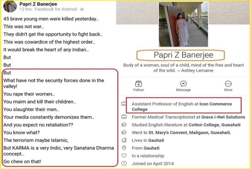 5. आसाम में आईकॉन कॉमर्स कॉलेज की असिस्टेंट प्रोफेसर पपरी बैनर्जी ने आतंकी हमले का समर्थन किया, बाद में लोगों का मजाक उड़ाया। कॉलेज ने तुरंत कार्रवाई करते हुए पपरी को सस्पेंड कर दिया। बाद में पपरी ने फेसबुक पर खेद भी व्यक्त किया।