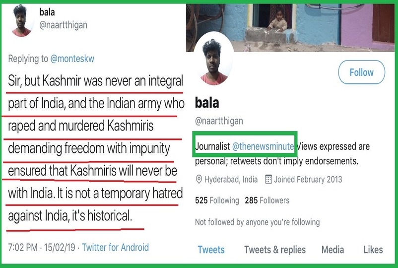 6. बाला हैदराबाद में ऑनलाइन मीडिया के पत्रकार हैं, इन्होंने न सिर्फ सुरक्षाबलों पर अभद्र आरोप लगाया। जबकि अलगाववादी बातें भी लिखी। इसके खिलाफ हैदराबाद में रिपोर्ट दर्ज करायी गयी है। इसके बाद बाला ने अपना अकाउंट बंद कर दिया, हालांकि इसकी कंपनी न्यूजमिनट की तरफ से कोई जवाब नहीं आया है।