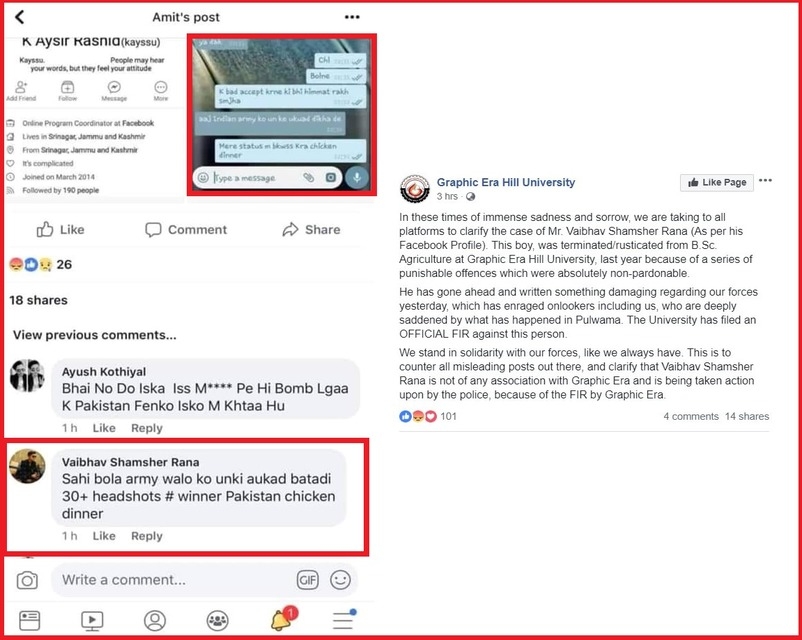 8. वैभव शमशेर राणा ग्राफिक एरा हिल यूनिवर्सिटी में स्टूडेंट था, फेसबुक पर जश्न मनाते कईं कमेंट किये। यूनिवर्सिटी ने शमशेर को न सिर्फ सस्पेंड कर दिया। बल्कि एफआईआर भी दर्ज करा दी।